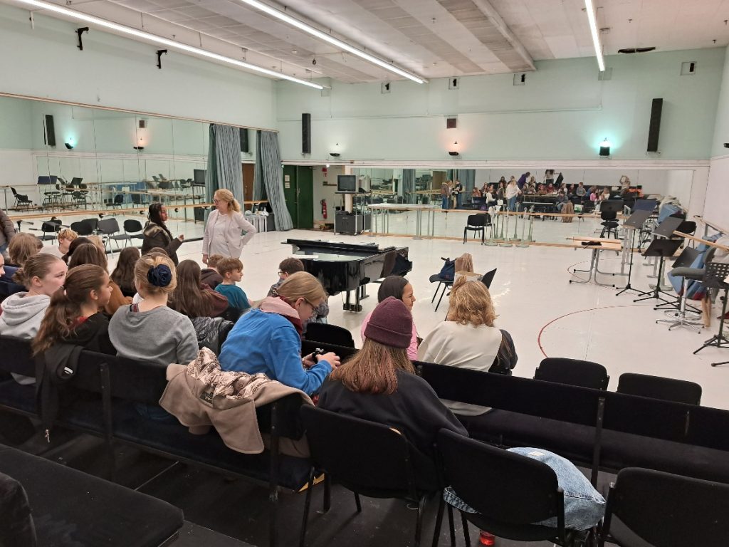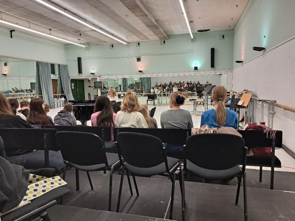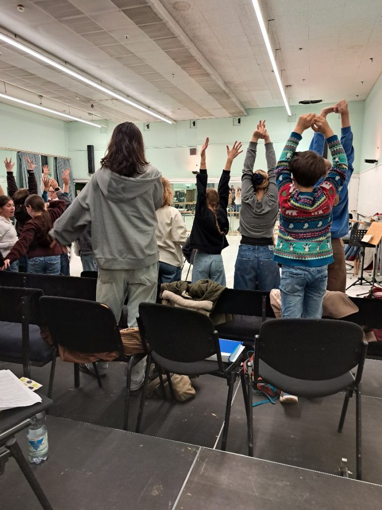 In diesen Wochen geht es um die Proben für die Oper „Hänsel und Gretel“ und für das Weihnachtskonzert mit dem Beethovenorchester am 23.12.2025. „Handys weg, Mappen weg, gerade Haltung – wir brauchen zum Einsingen nur unseren Körper und unsere Stimme“, Ekaterina Klewitz lächelt, wird aber nun etwas energischer. Sie setzt sich an den Flügel – und los geht’s mit den Aufwärmübungen.