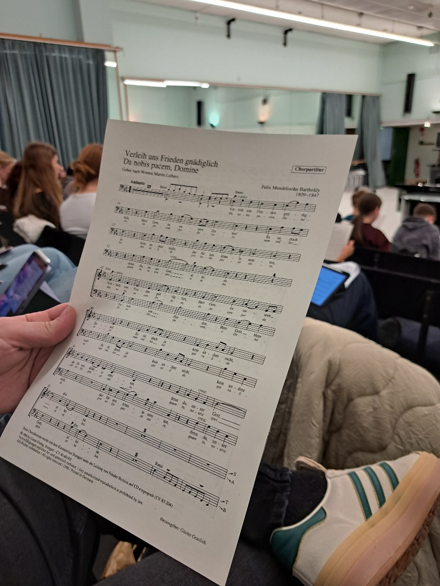Nach der Pause geht es mit einem Lied für das Weihnachtskonzert weiter. Die Kantate „Vom Himmel hoch“ hat es in sich. Es ist eine anspruchsvolle Version des bekannten und volkstümlichen Weihnachtsliedes. Die Stimmen üben nun einzeln. „Sopranchen, bitte Takt 70“. – „Das ist ein ‚Des‘, macht euch einen Kreis um die Note, dann merkt ihr sie euch besser“. –„Ich brauche saubere Töne und richtigen Rhythmus. Text ist nicht so wichtig, noch nicht.“